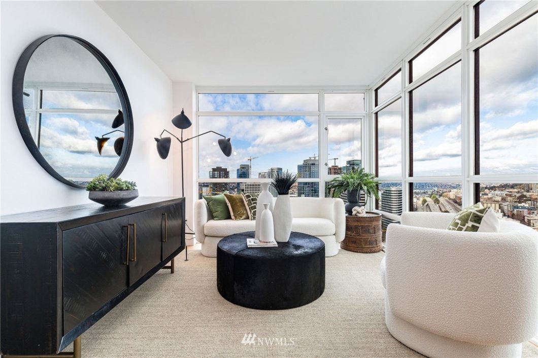 Live the luxury urban lifestyle in this light-filled corner sub-penthouse unit with sweeping views of downtown from almost every room. Step inside to a spacious floorplan w/ hardwood floors & a dreamy chef’s kitchen w/ high-end appliances. Mix up cocktails as your guests hang at the kitchen bar, serve dinner in the inspiring dining area, relax in front of the gas fireplace or sophisticated lounge area. A spacious primary suite has double closets + adjoining spa shower and dual sinks. Plus there is an inviting office/guest rm, 2nd full bath, A/C, washer/dryer. 2 pkg spaces, 2 storage units. The elegant building offers 24/7 concierge, gym, hot tub, guest suite, visitor parking & more. Steps to everything Capitol Hill + downtown has to offer!
