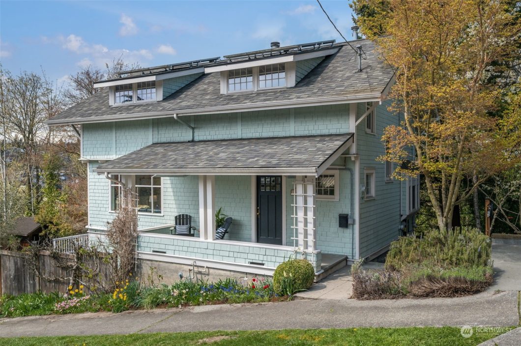 Madrona turn-of-the-century gracious home updated for modern living yet retains all the timeless vintage details. Set on a corner lot offering privacy & territorial views; the welcoming front porch leads to a proper entry & spacious living areas w/ soaring ceilings, rich moldings, box beams & rare narrow plank hardwood floors. A well-appointed kitchen w/ gas stove, quartz counters & bar seating compliments the incredible backyard w/ a deck for al fresco entertaining. Upstairs is the ideal layout of a primary suite plus 2 add’l bedrooms & full bath. Daylight basement has a guest suite, family room & office. Updated systems, solar panels, EV charger round out this special home. Walk 5 blocks to eats, drinks, parks, retail of Madrona Village.